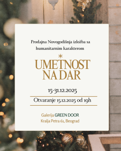 Novogodišnja prodajna izložba „Umetnost na dar“ biće otvorena 15. decembra u 19 časova u Green Door galeriji a publika će imati prilike da je poseti do kraja decembra. Dobrodošli da zajedno slavimo umetnost i darivanje, odaberite nešto što bi poklonili sebi ili nekom dragom i time učestvovujte u humanitarnom darivanju.